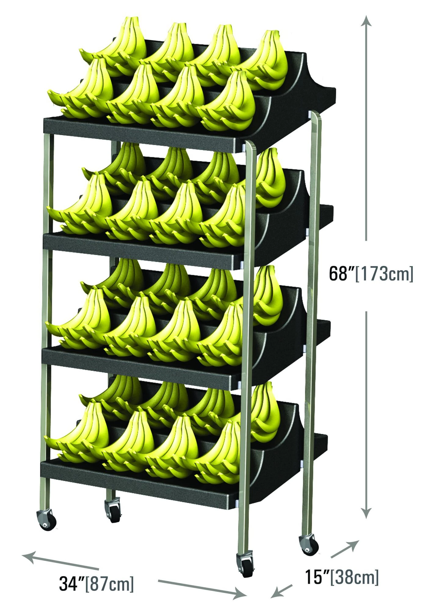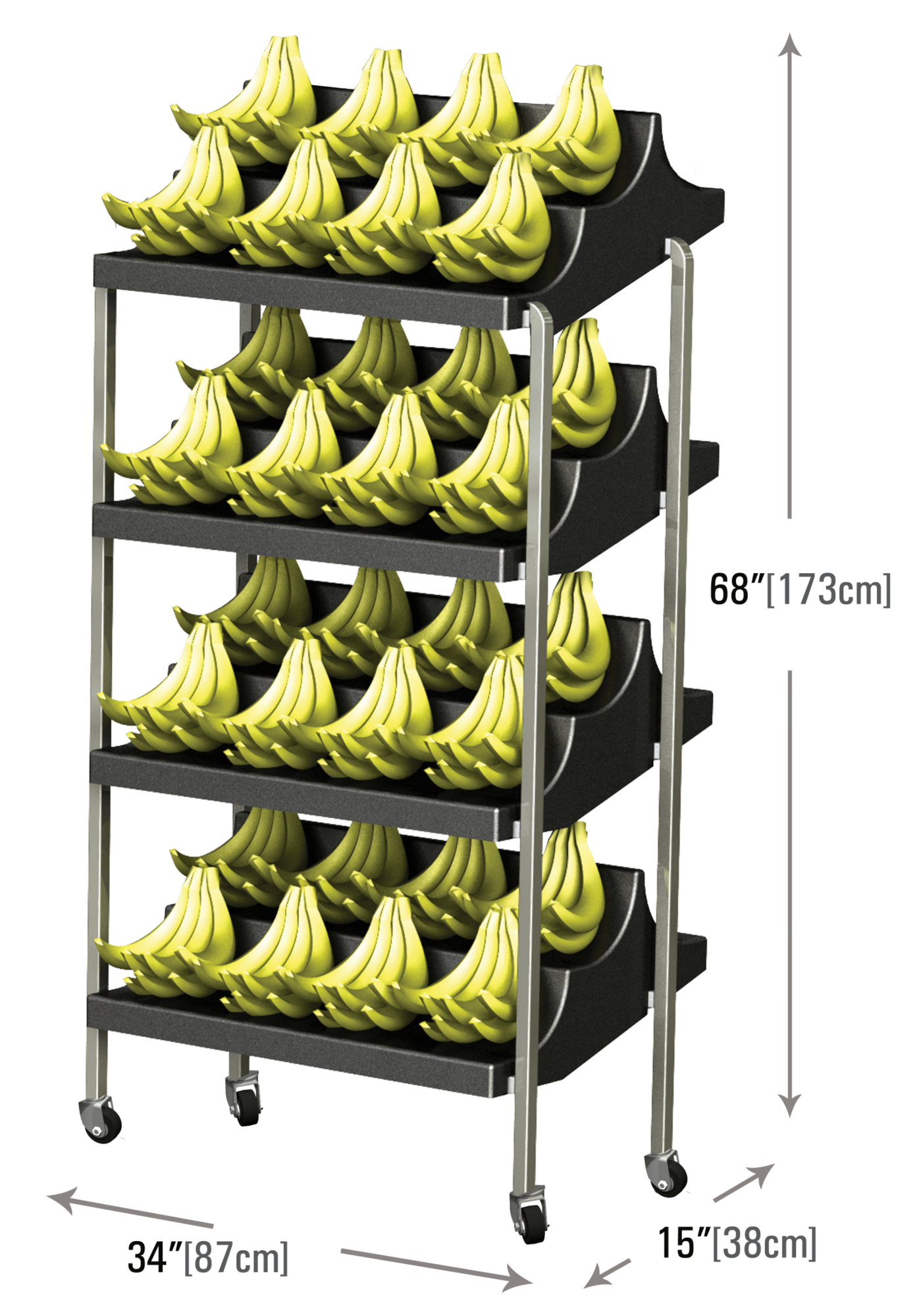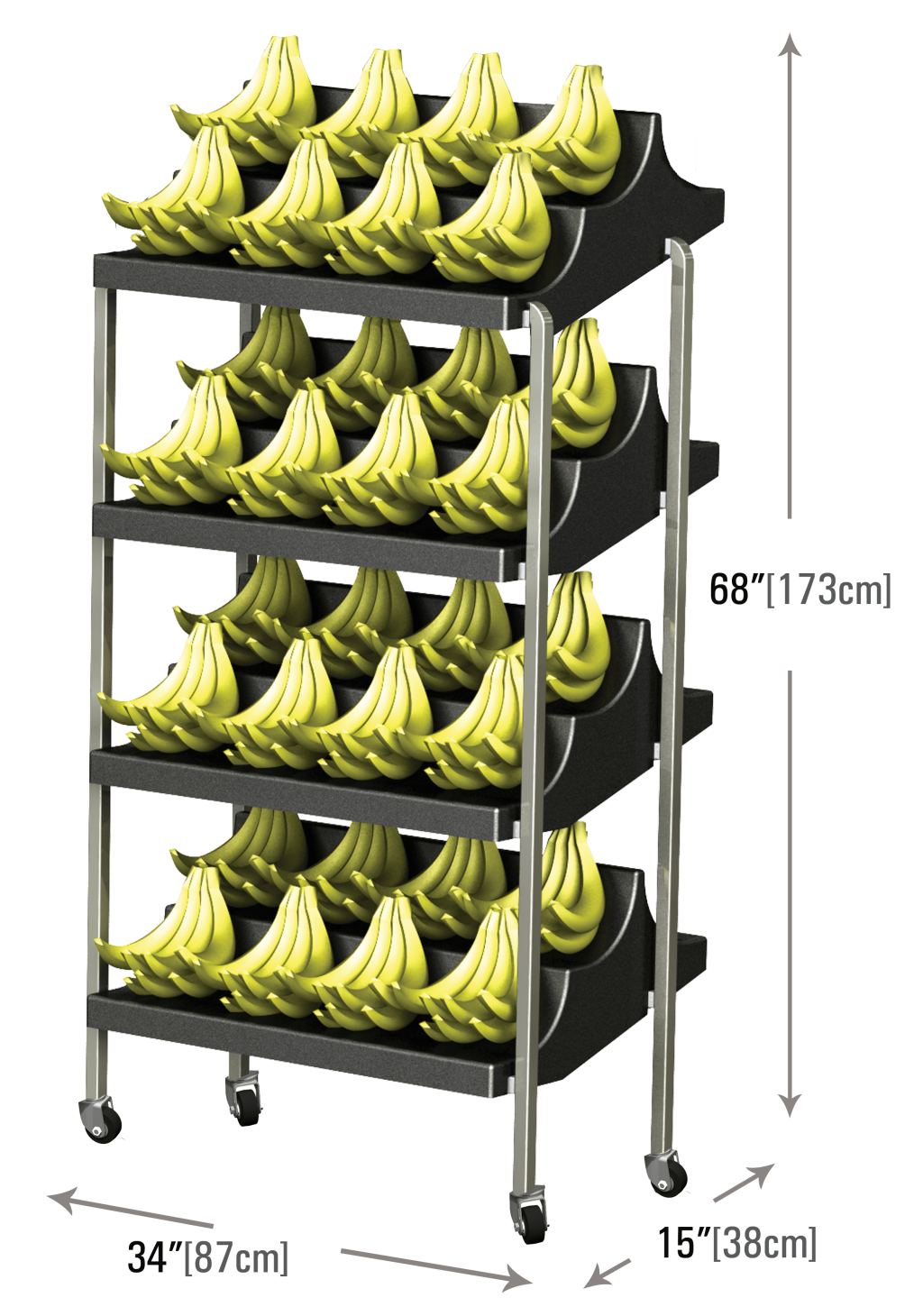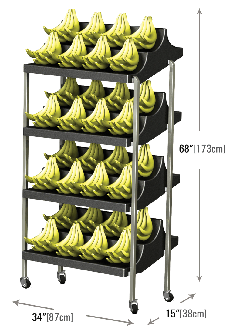 Steel frame with contoured ABS plastic banana trays. Mobile display for versatile cross merchandising in-store.