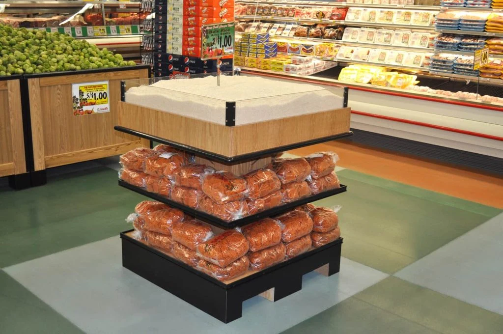 Durable bulk fixtures efficiently merchandise beans, rice, spices, and packaged goods with modular tables, spice displays, and gravity or scoop bins—featuring clear panels, adjustable shelving, and space for cross-merchandising.