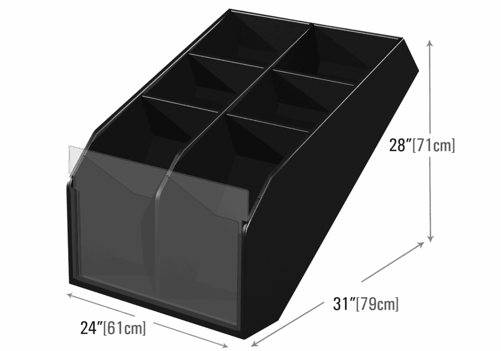 A taller and deeper clear front riser designed to merchandise one to six items. Optional clear front available 4”[11cm] higher.