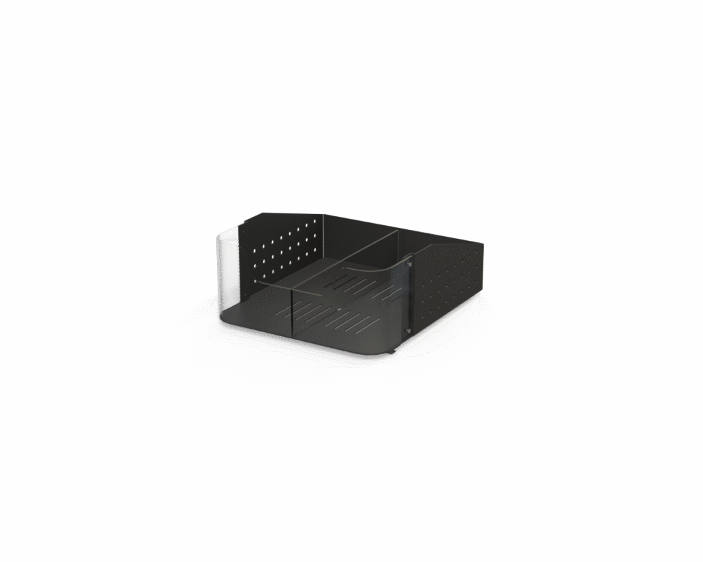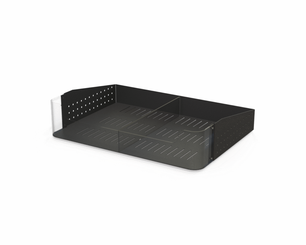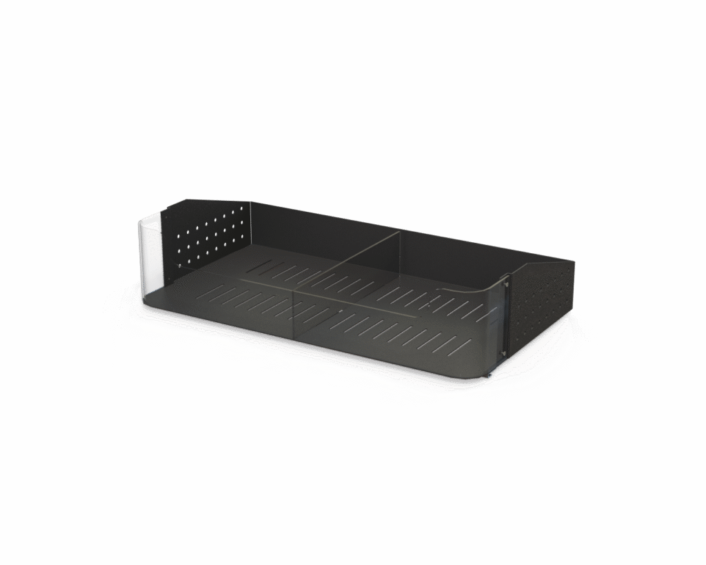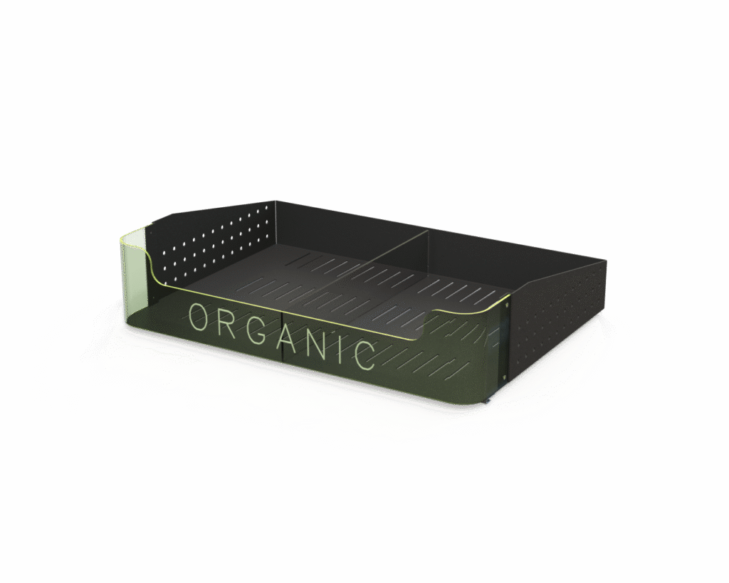 Aluminum body with clear front fence tray. Sits on Versa Cross bar [V-BAR]. Deep clear front fence to keep produce in place and clearly visible. Minimum shelf showing maximizing produce presentation. Perforated shelf for air circulation
