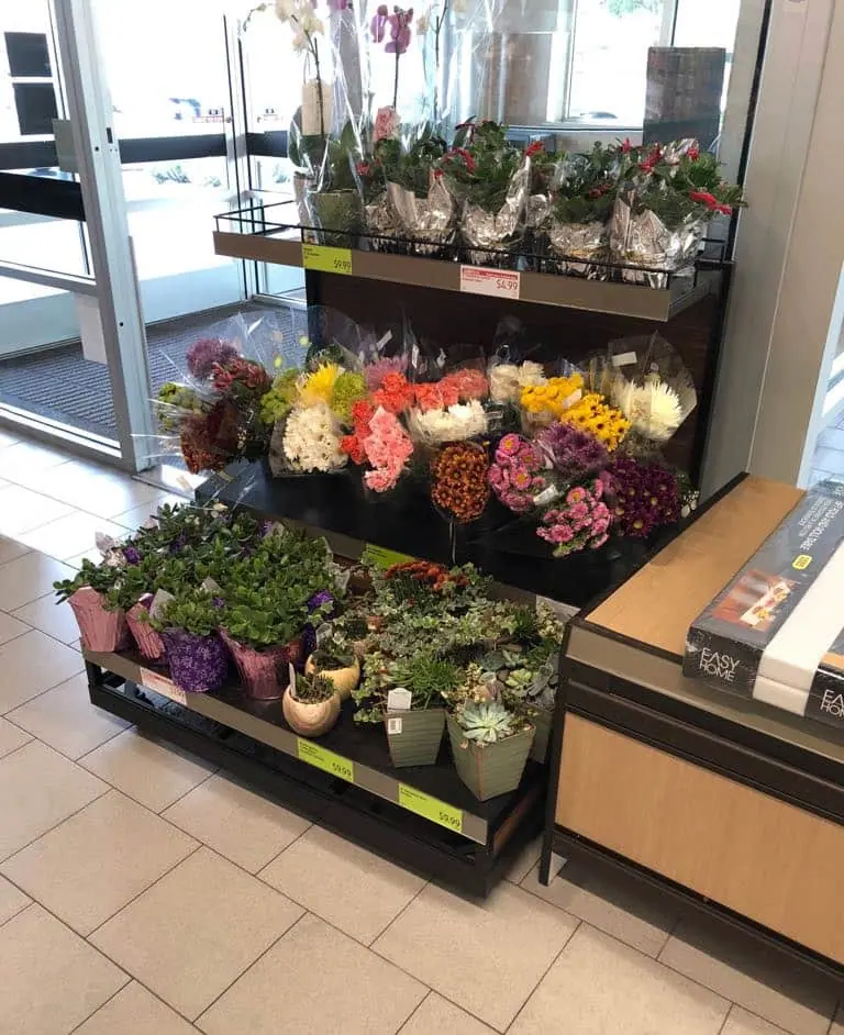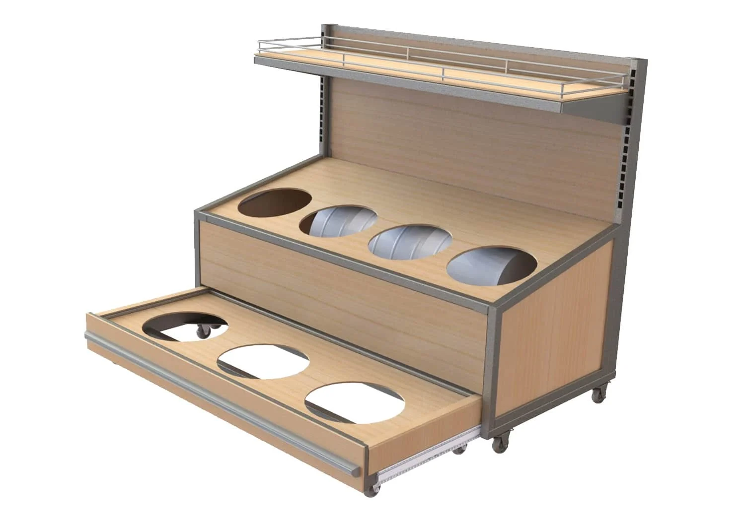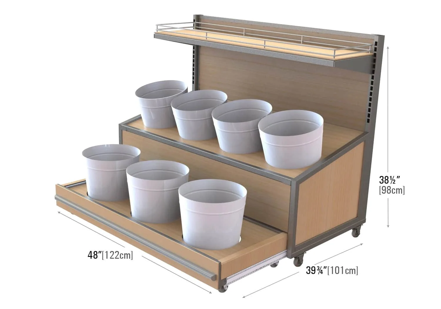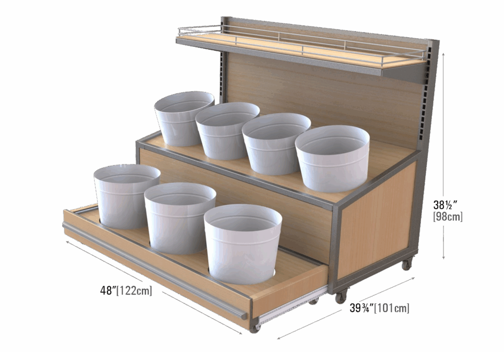 Sturdy metal floral frame display with a convenient pull-out bottom roller drawer for additional floral merchandising. The base boxed frame converts into an storage space for neatly putting away buckets.