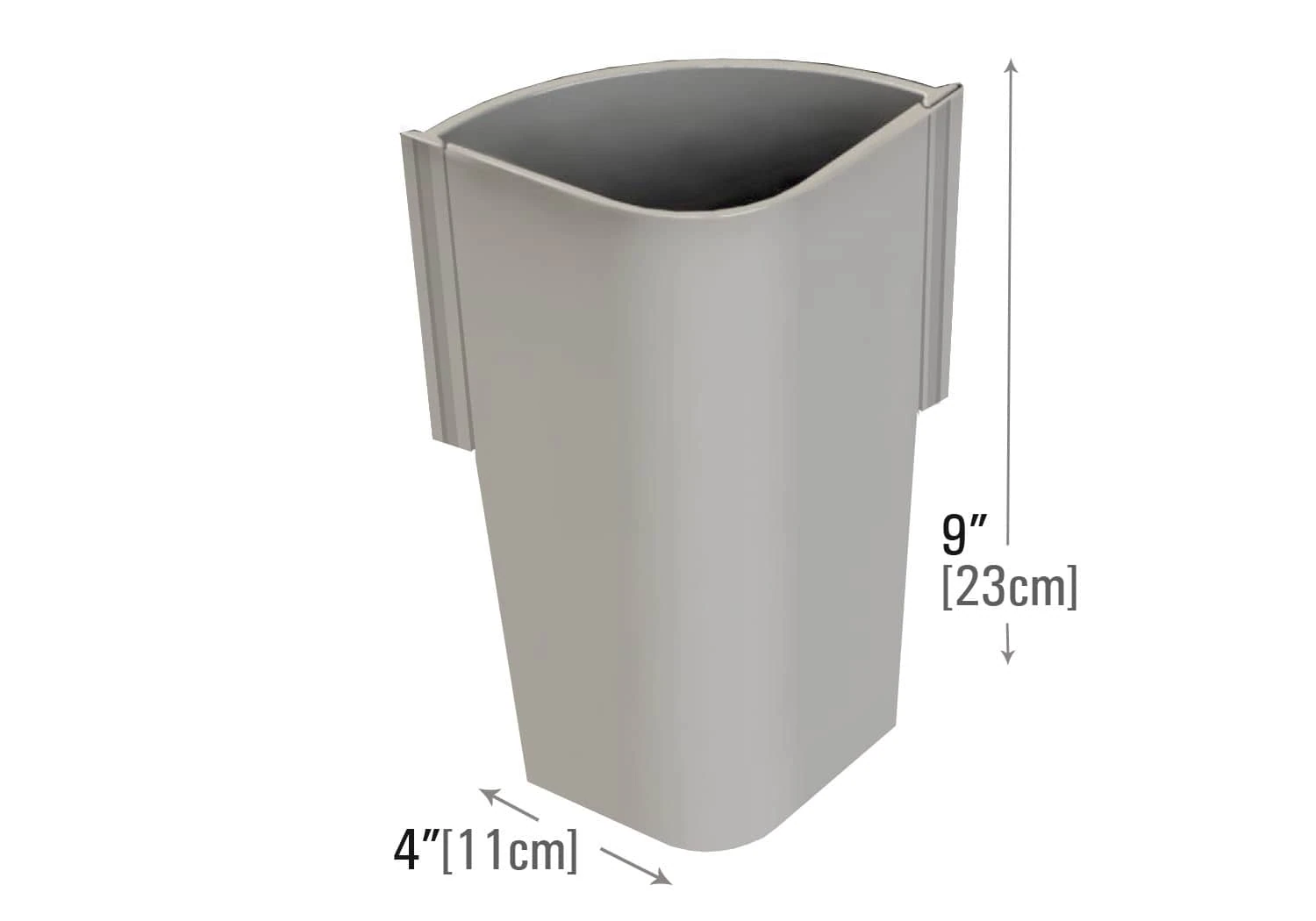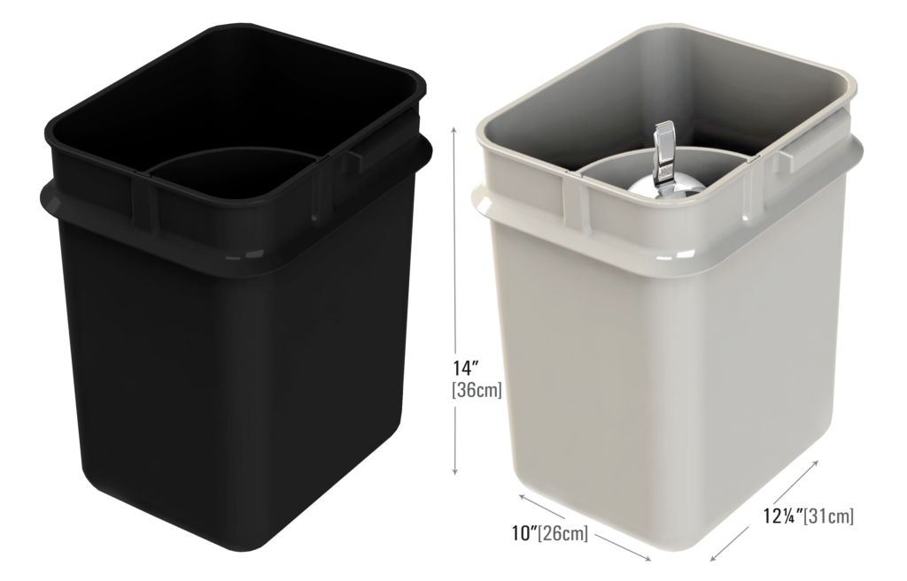 Sturdy plastic bucket with a built-in scoop compartment. A clear divider separates the scoop from the bulk product. Scoop and lid are sold separately. Available in white.
