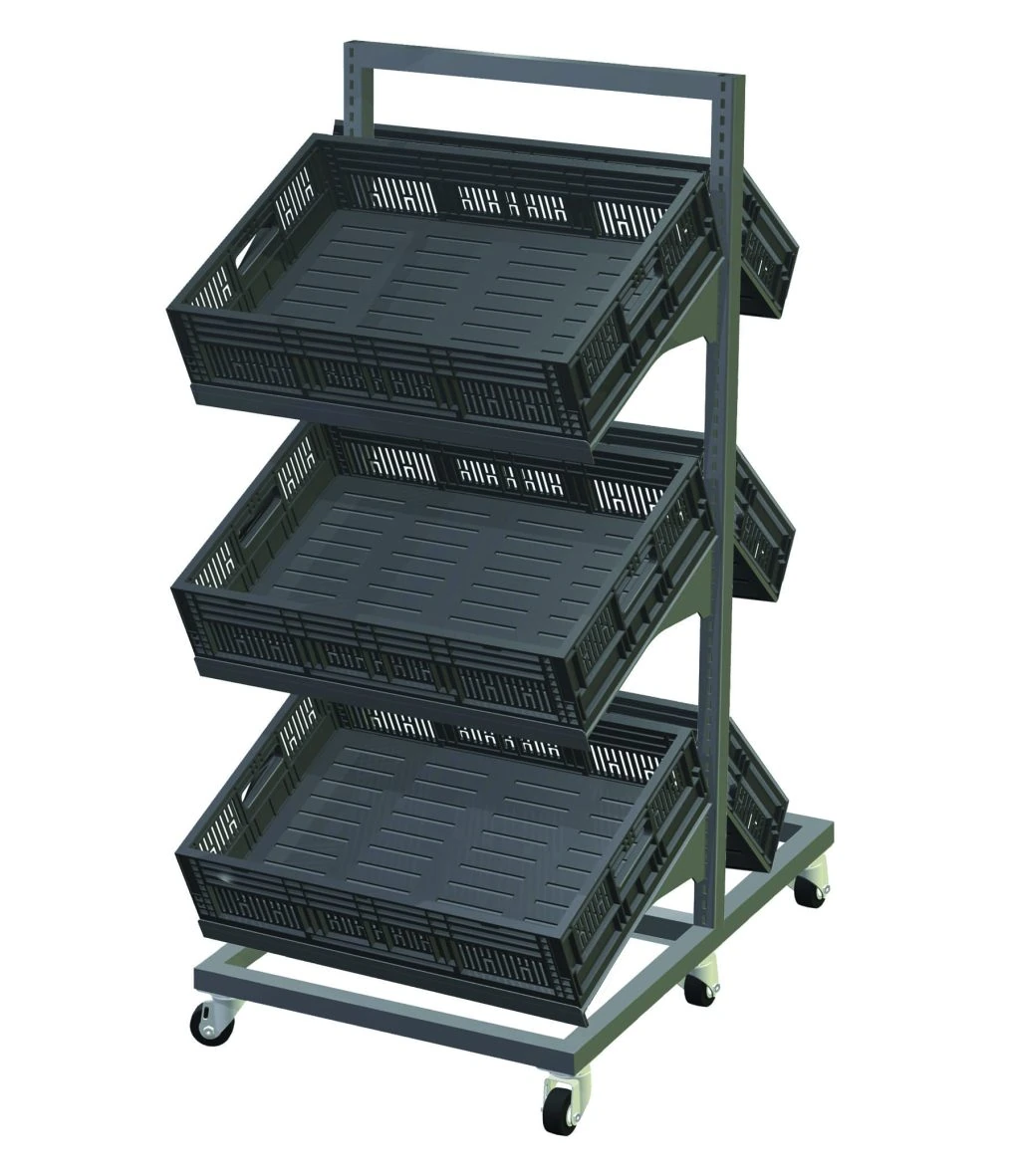 Collapsible RPCs feature durable plastic with a rustic wood look for a farmers’ market feel. Breathable, stackable, and easy to store, they offer optional inserts and dividers for organized displays.