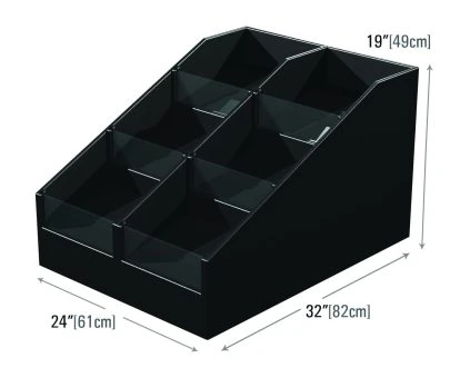Square bins combine durability and versatility with wood, plastic, and metal options to fit any style. Configurable with risers and accessories, they enhance visibility, adapt to promotions, and create clean, attractive displays.