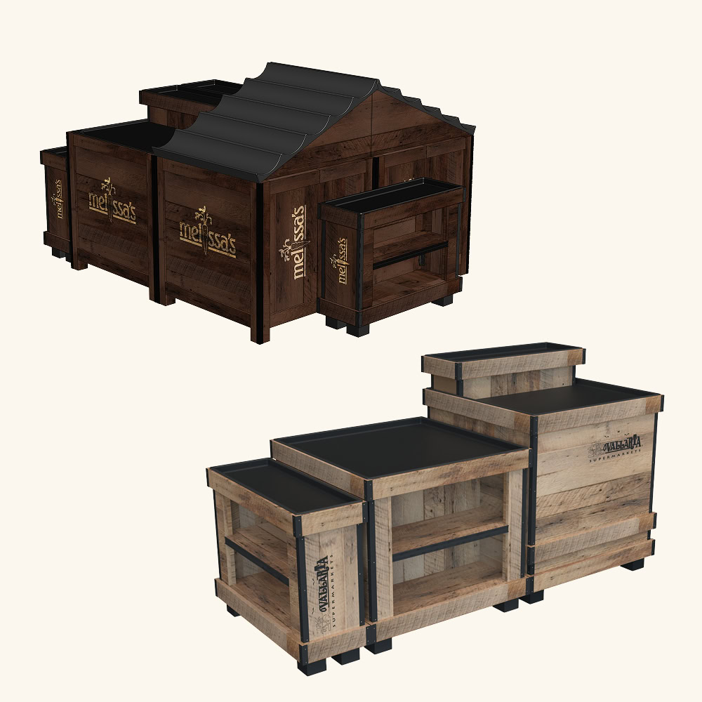 Through our partnership with an abroad-based facility, we’ve elevated our orchard bins by crafting them from reclaimed wood. This innovation reduces deforestation, lowers carbon emissions, and brings authentic, natural character to every display. Each fixture can also be customized with engraved logos, seasonal callouts, or promotional details, giving retailers a durable, stylish, and branded way to showcase products while staying rooted in environmental responsibility.