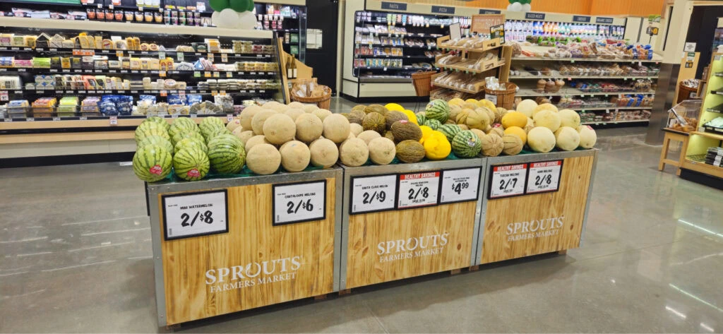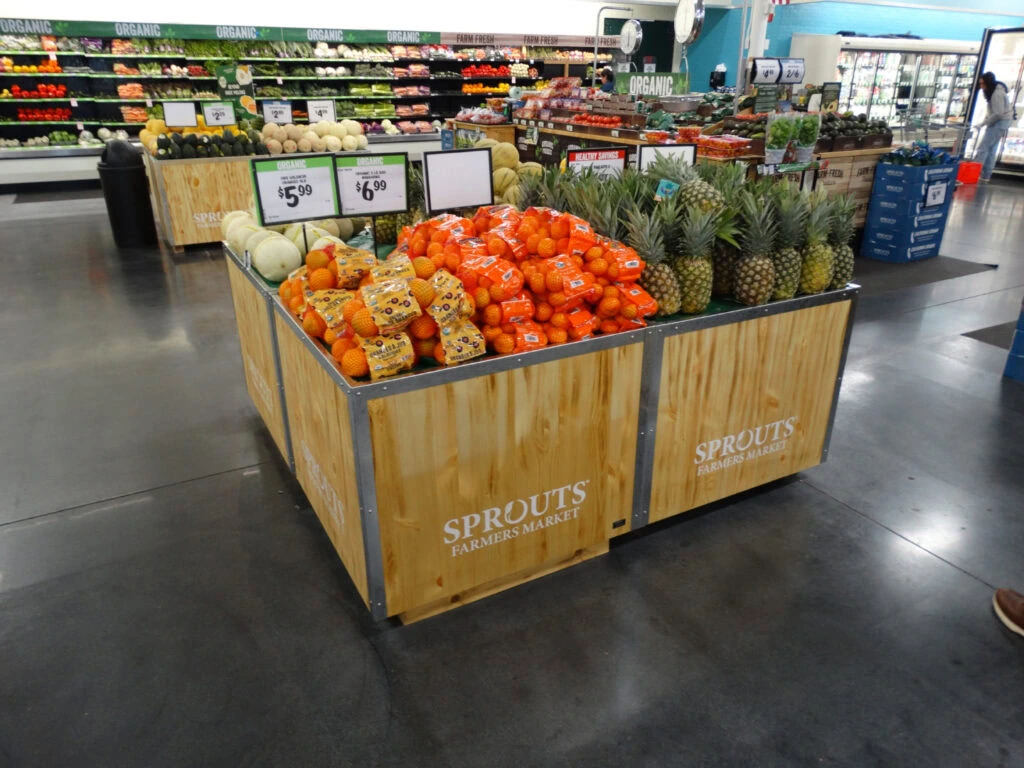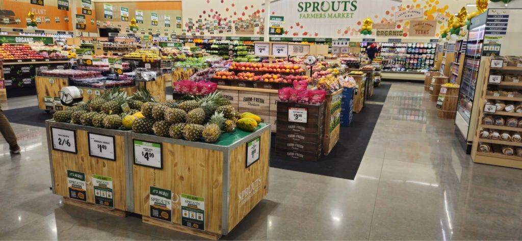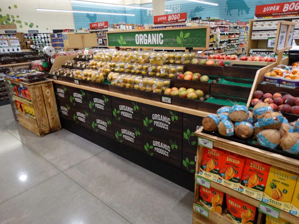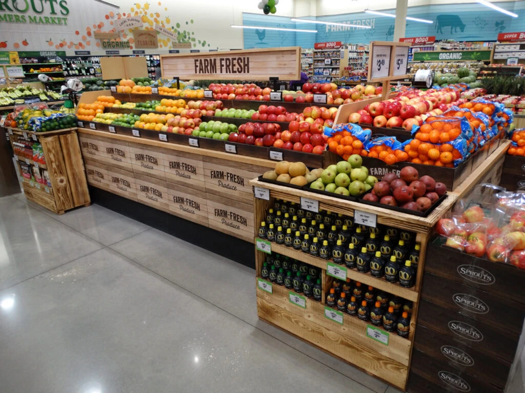 The combination of warm wood tones, clean sight lines, and vibrant produce colors invites customers to slow down and explore, turning a routine grocery stop into an energizing, fresh-from-the-farm experience.