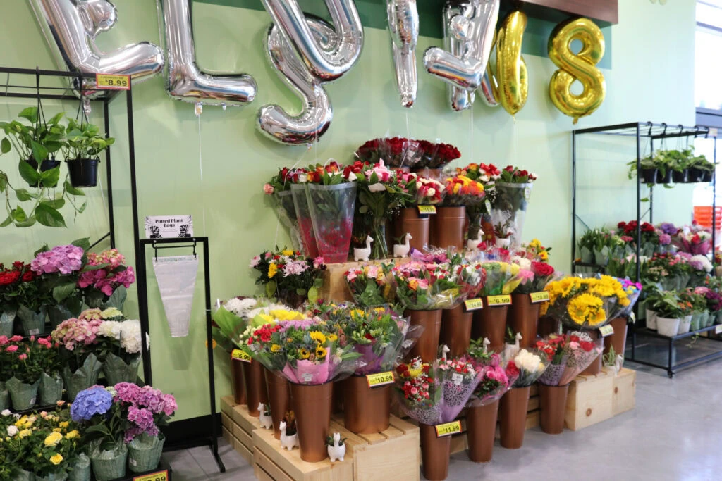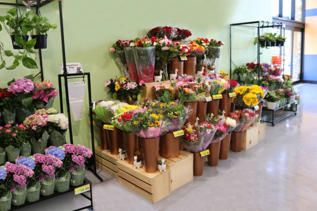 This floral department combines two complementary display styles to showcase product beautifully. The metal grid-top display with ABS trays is designed for hanging baskets, built with swivel and locking casters for easy movement and stability. Alongside it, a tiered wood bucket display adds depth and organization, keeping flowers accessible and visually abundant.