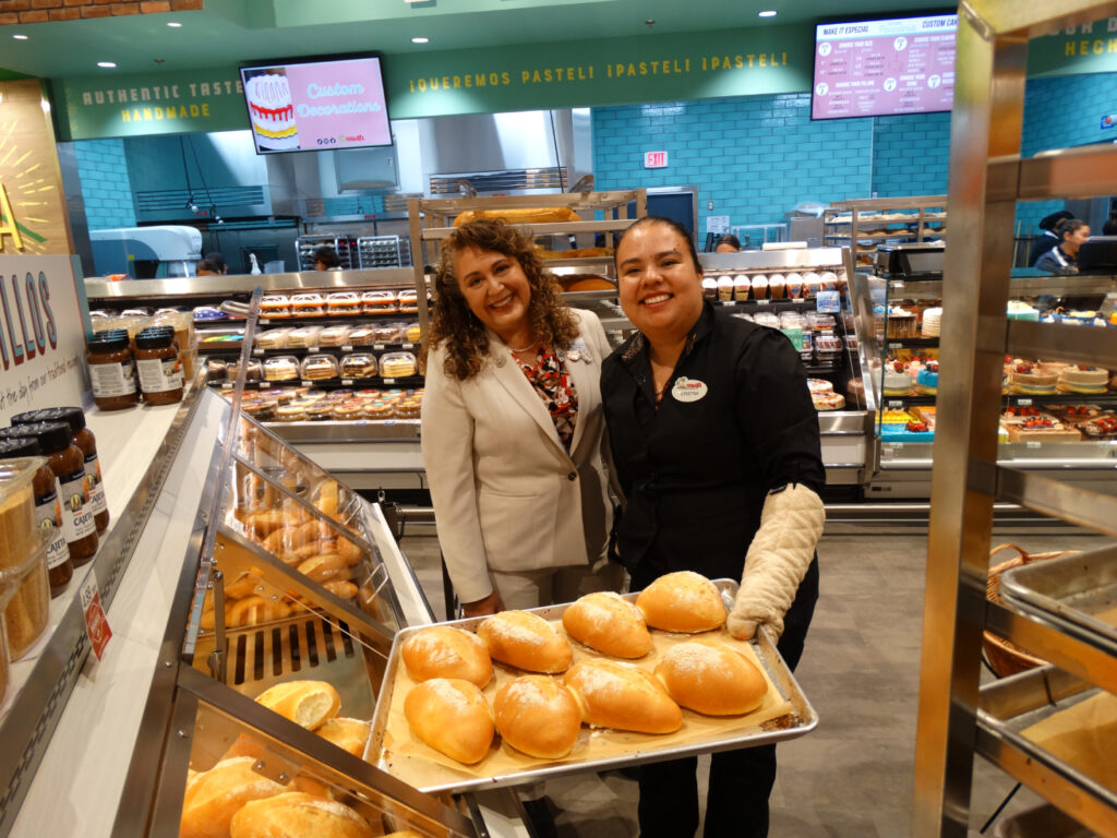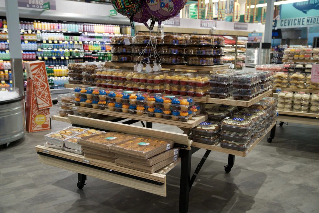 This recent bakery installation highlights the warmth and abundance of fresh bread and pastries with custom fixtures designed to balance function and presentation. At the center is our bolillo table—crafted for high-volume bread displays while maintaining a clean, inviting look that feels approachable and organized.