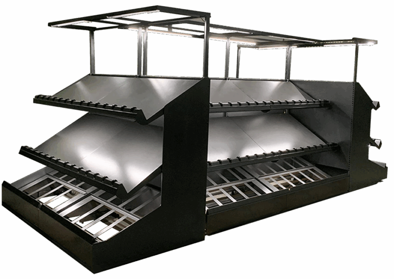 Mobile metal displays combine durability and flexibility with locking casters for easy movement. Adjustable shelves showcase RPCs, boxes, or trays, while optional canopies and price tracking add an upscale, polished look.