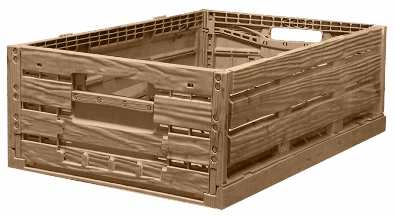 Collapsible RPCs feature durable plastic with a rustic wood look for a farmers’ market feel. Breathable, stackable, and easy to store, they offer optional inserts and dividers for organized displays.