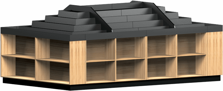 Flexible bakery nesting tables with tiered displays and lower shelving, available in customizable oak or laminate finishes, designed to adapt seamlessly to your store layout and décor.