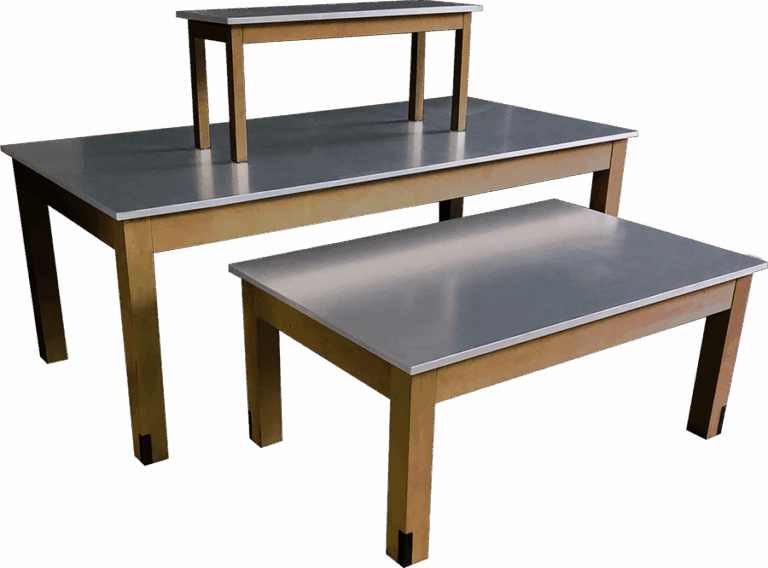 Euro tables feature adjustable tops and versatile designs for easy merchandising. Available in wood, steel, or mixed materials, they offer drawers, flip fronts, and tiers—ideal for boxed items, RPCs, or seasonal promotions.