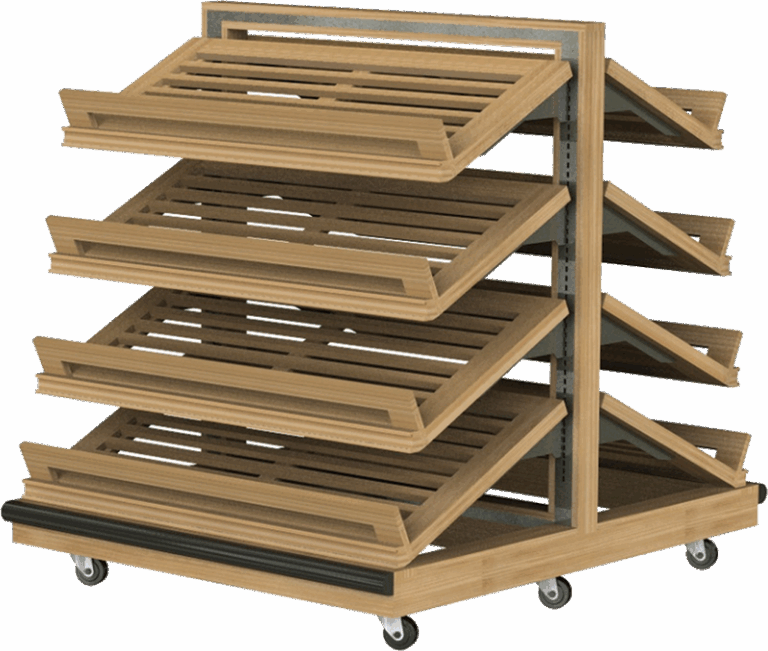 Bread shelving systems in gondola or wood-stained designs maximize space, keep products organized, and deliver sturdy, attractive displays that simplify selection while elevating everyday baked goods.
