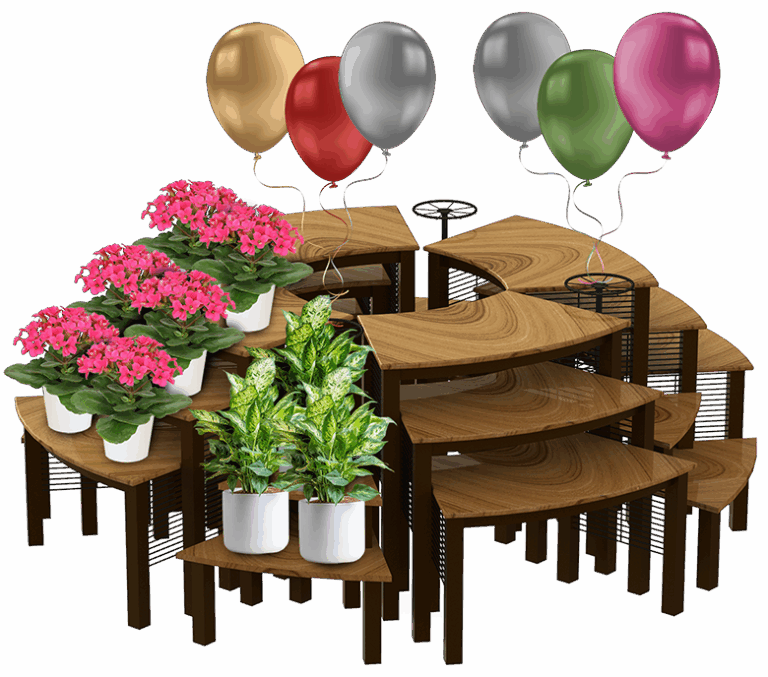 Floral nesting tables create layered, flexible displays that highlight flowers and plants. With multiple configurations, they pair with tiers or balloon stands to enhance promotions and attract customers.